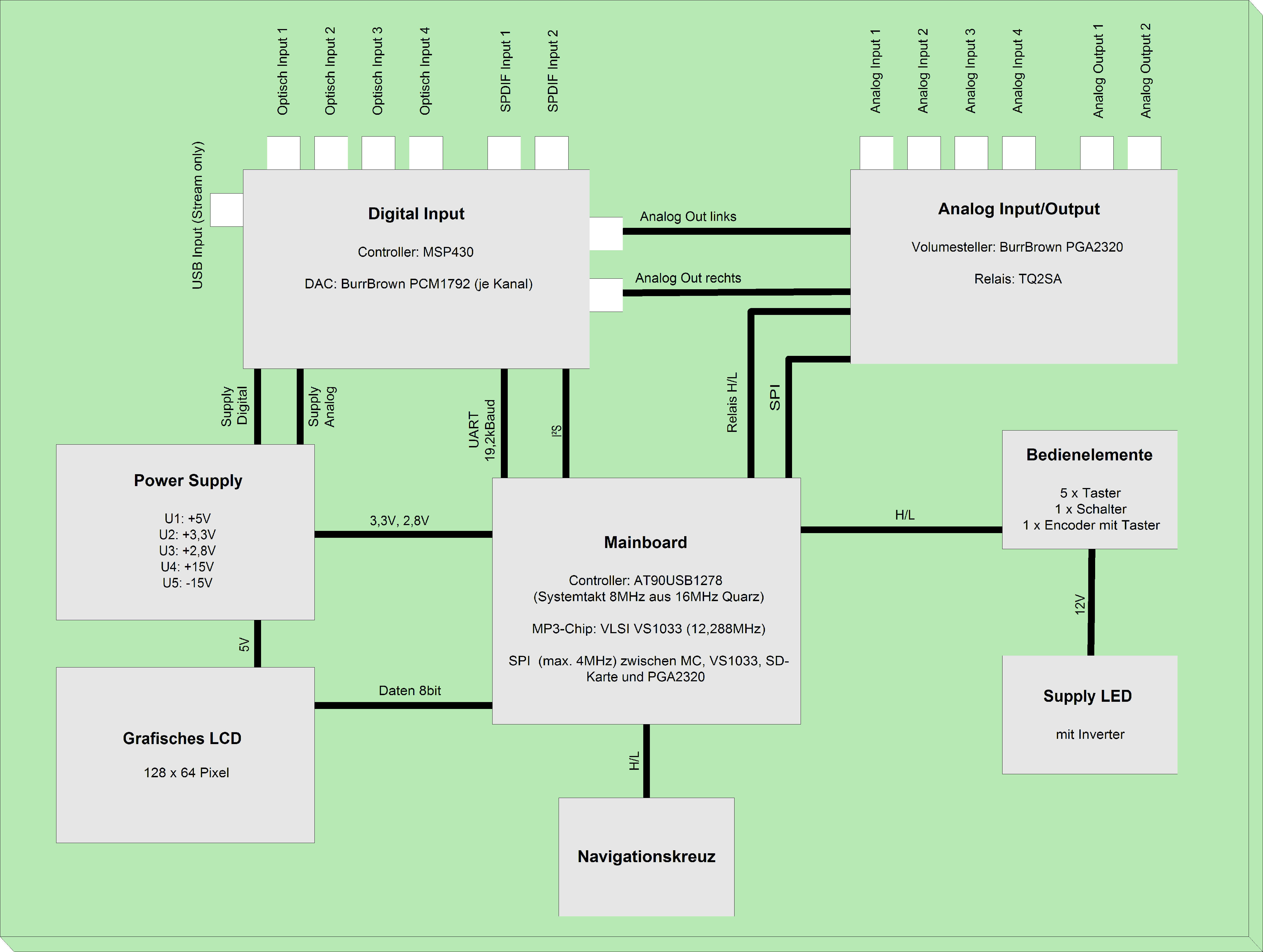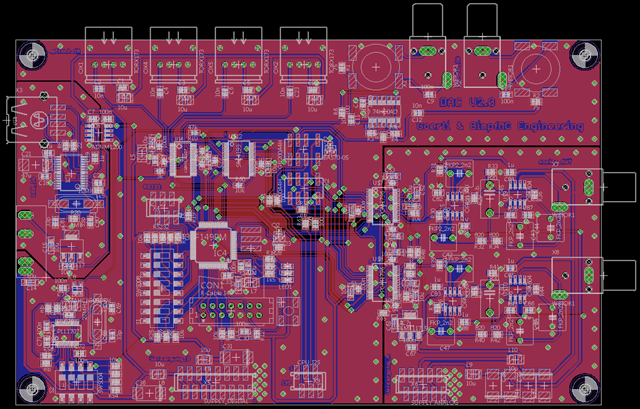 Nach langer Entwicklungs-, Bau-, und Optimierungszeit ist der selbst entwurfene Quellenumschalter von Patrick und mir fertig gestellt. Der Quellenumschalter, auch SourceSwitcher (SSw) genannt, trumpft mit folgenden Eingängen für die gängigsten Audio-Signale auf: 4x optisch S/PDIF TORX173, 2x S/PDIF koaxial, 1x USB-Stream, 1x SD-Karte (MP3, FAT16 und FAT32), 4x Chinch. Nach Verarbeitung der Signale im SourceSwitcher werden diese über je einen DAC von BurrBrown pro Kanal an einen Röhrenverstärker weiter gegeben.