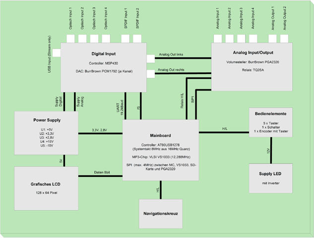 + Das Blockschaltbild zeigt in vereinfachter Form die Vernetzung der einzelnen Platinen und der wichtigsten Signale. Zum Vergrößern bitte auf das Bild klicken!